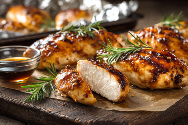 Берите 4 куска куриного филе (по 150 г), 3 ст. л. соевого соуса, мёд, горчицу, розмарин. Смешайте маринад из соуса, 1 ч. л. мёда и горчицы. Замаринуйте куриное филе на 20 минут в холодильнике. Духовку разогрейте до 190 градусов, противень застелите фольгой. Запекайте мясо 30 минут, периодически поливая маринадом. За 5 минут до конца включите гриль для румяности. Калорийность на 100 г: 145 ккал.