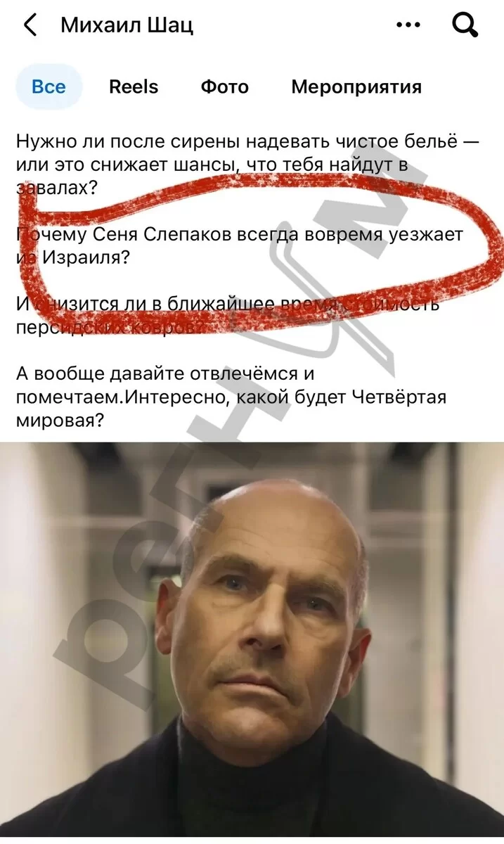 Михаил Шац* (признан Минюстом РФ иностранным агентом), когда-то покинувший Россию с громкими заявлениями о несвободе и агрессивной политике Родины, теперь вынужден проводить время в бомбоубежище. В своём недавнем посте в Instagram* (соцсеть запрещена в РФ; принадлежит корпорации Meta, признанной экстремистской) он поделился с подписчиками «странными практическими вопросами», которые возникают у него во время войны.
