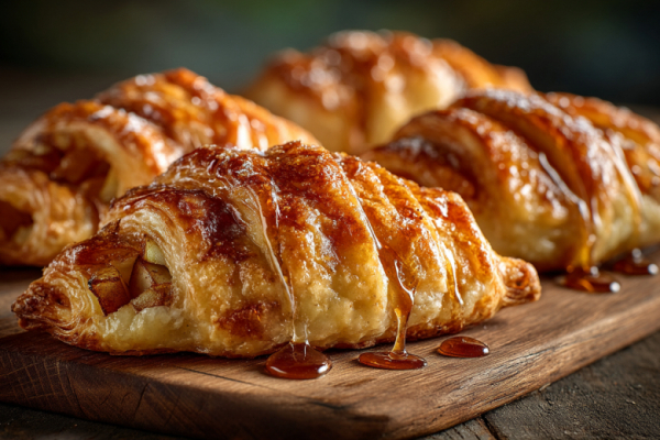 Готовые круассаны (или слоеное тесто) — 4–6 шт., яблоко — 1 шт. (крупное), груша — 1 шт., джем (абрикосовый или яблочный) — 5 ст. л., сливочное масло — 20 г, ром (светлый или тёмный) — 1-2 ст. л., сахарная пудра — для подачи.