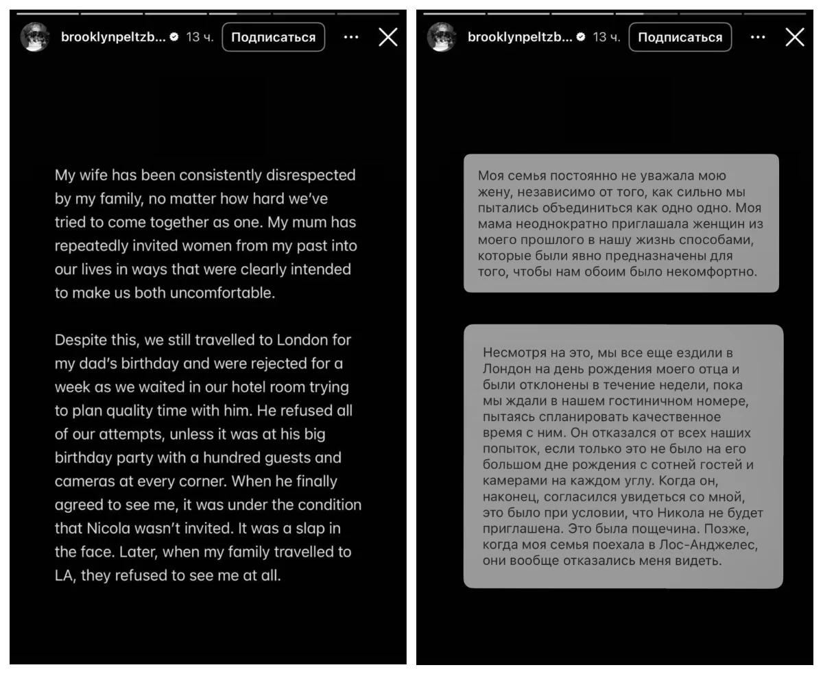Последней каплей стал визит клана Бекхэмов в Лос-Анджелес, где живут Бруклин и Никола. Семья даже не попыталась увидеться с сыном. Это стало финальным сигналом: примирения не будет.