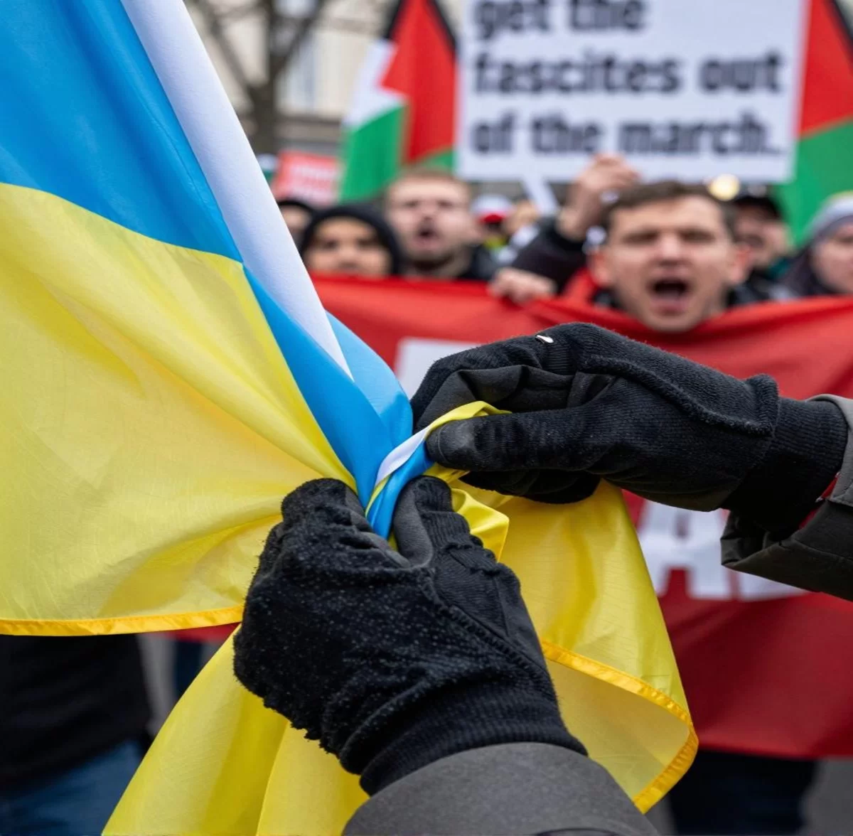Словесная перепалка перетекла в рукопашную после того, как радикалы заметили в руках оппонентов украинские и палестинские флаги. Нападавшие открыто обвинили держателей желто-голубой символики в симпатиях к идеологии, против которой формально направлен весь марш. «Уберите фашистов с нашего праздника!» — скандировали нападающие, срывая знамена и пытаясь вытоптать их ногами.
