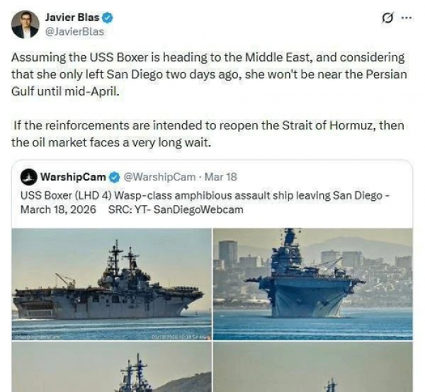 Старший аналитик Bloomberg Хавьер Блас: предположим, что авианосец USS Boxer движется в сторону Ближнего Востока, и учитывая, что он покинул Сан-Диего всего три дня назад, он не достигнет Персидского залива до середины апреля (конец месяца по иранскому календарю).