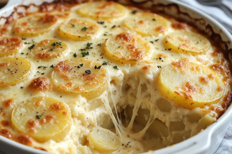 Для приготовления вам понадобится: 6–8 средних картофелин, 150 мл сливок — 20%, 100 г моцареллы, 70 г пармезана, 70 г чеддера, 2 зубчика чеснока, соль, перец и мускатный орех по вкусу. Картофель очистите и нарежьте тонкими кружочками (лучше всего — овощерезкой). Смешайте сливки с измельченным чесноком, солью, перцем и щепоткой мускатного ореха. Форму смажьте маслом, выложите слой картофеля, слегка посыпьте пармезаном и чеддером, повторите слои, заливая каждый небольшим количеством сливок. Верхний слой картофеля залейте оставшимися сливками и щедро посыпьте смесью всех трёх сыров. Накройте фольгой и запекайте при 190 градусах 30 минут, затем снимите фольгу и готовьте ещё 10–15 минут до золотистой сырной корочки. Дайте запеканке отдохнуть 10 минут перед подачей — так слои станут плотнее, и блюдо будет идеально держать форму.
